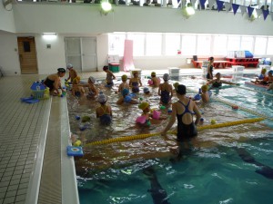 プールでは、赤・青・黄・緑・ピンクのチームごとに分かれて、