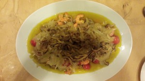 海老、キノコ類、たまねぎそしてもちろんオリーブオイルたっぷり。
