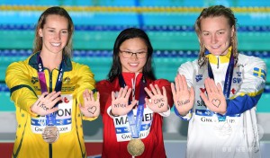 上の写真は、女子100mバタフライの表彰式での一幕です。手
