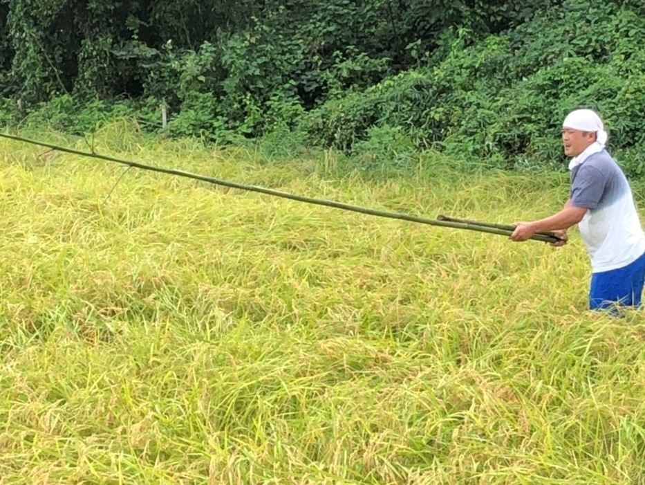 まずは、露払い。竹を切り、稲の穂の露を落とします。