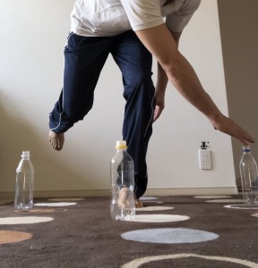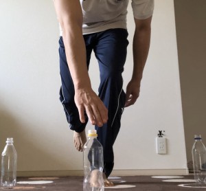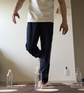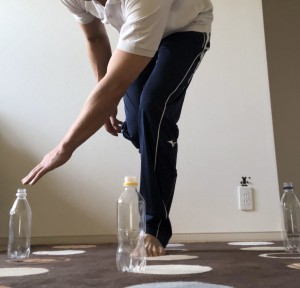 ①片足で立ち、その左右と正面にペットボトルを1本ずつ置きます。