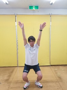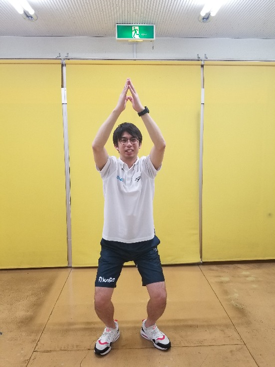 ④腕が前にまっすぐ伸びた時に、足はお尻の近くまでグッと曲げ、