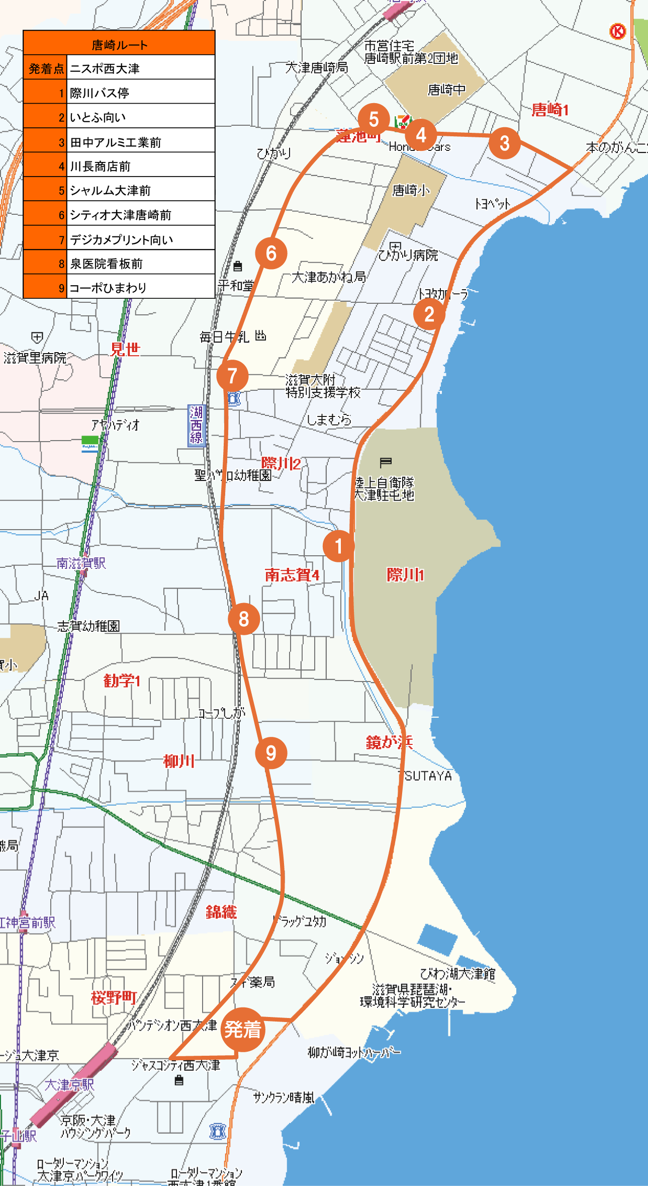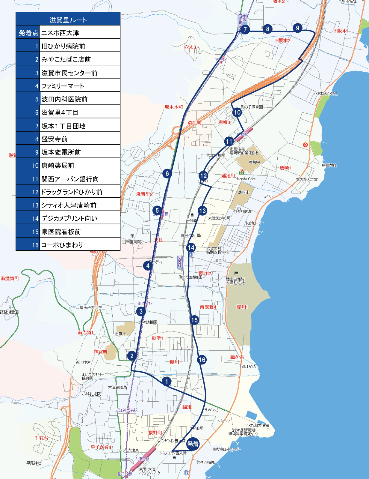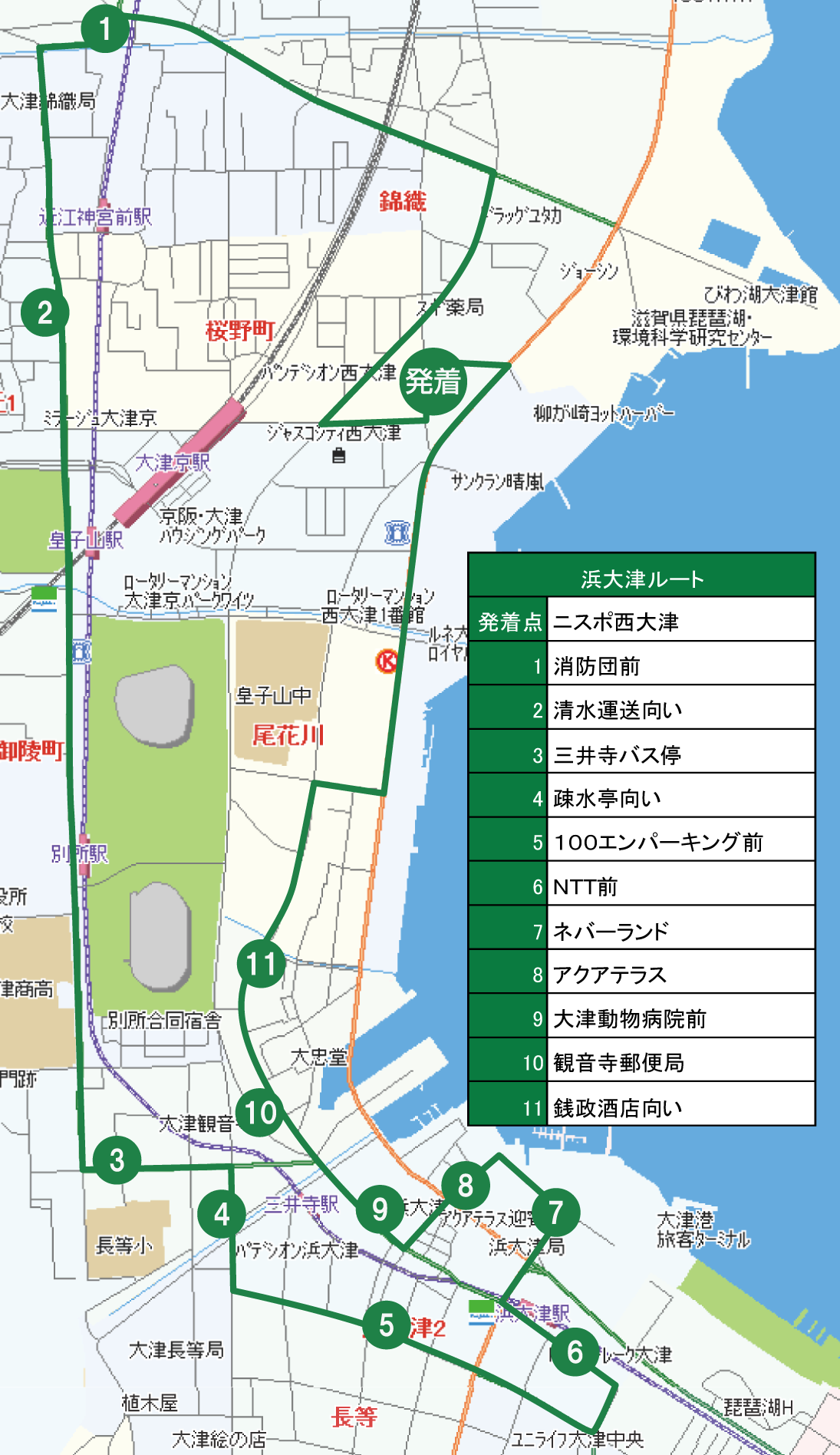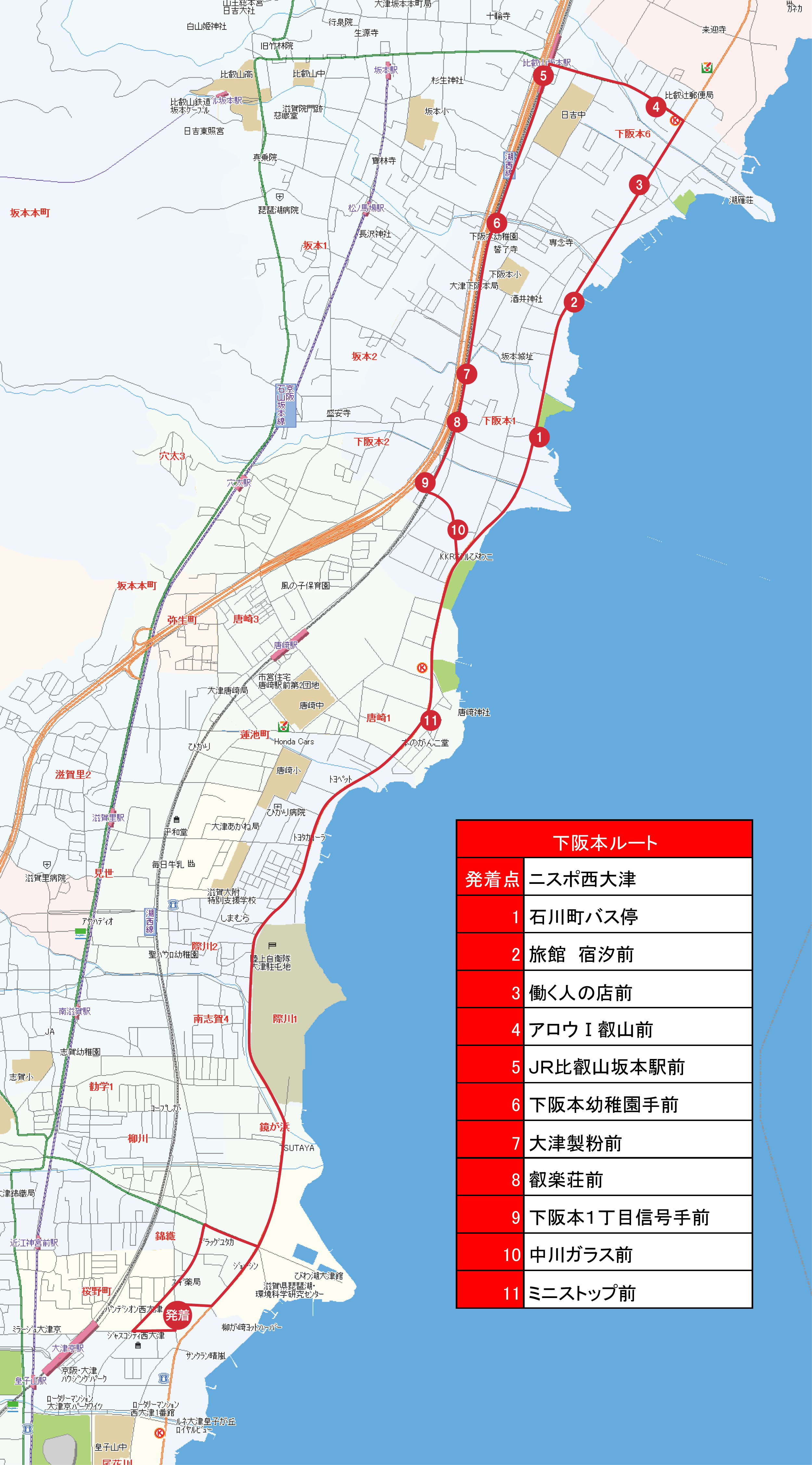 <ニスポ・スイムクラブ西大津までのバスルート> バス1・・・下阪本ルート バス2・・・唐崎ルート バス3・・・浜大津ルート バス4・・・滋賀里ルート