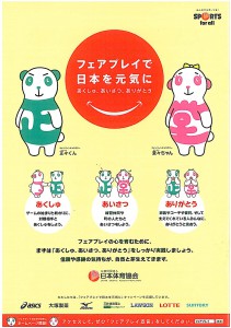 水泳連盟の講習会に参加した際に日本体育協会から発行された小さな冊子をいただきました。今回はその中身の話ではなく、裏表紙にあった「フェアプレイで日本を元気に」という日本体育協会のキャンペーンキャラクターについてです。