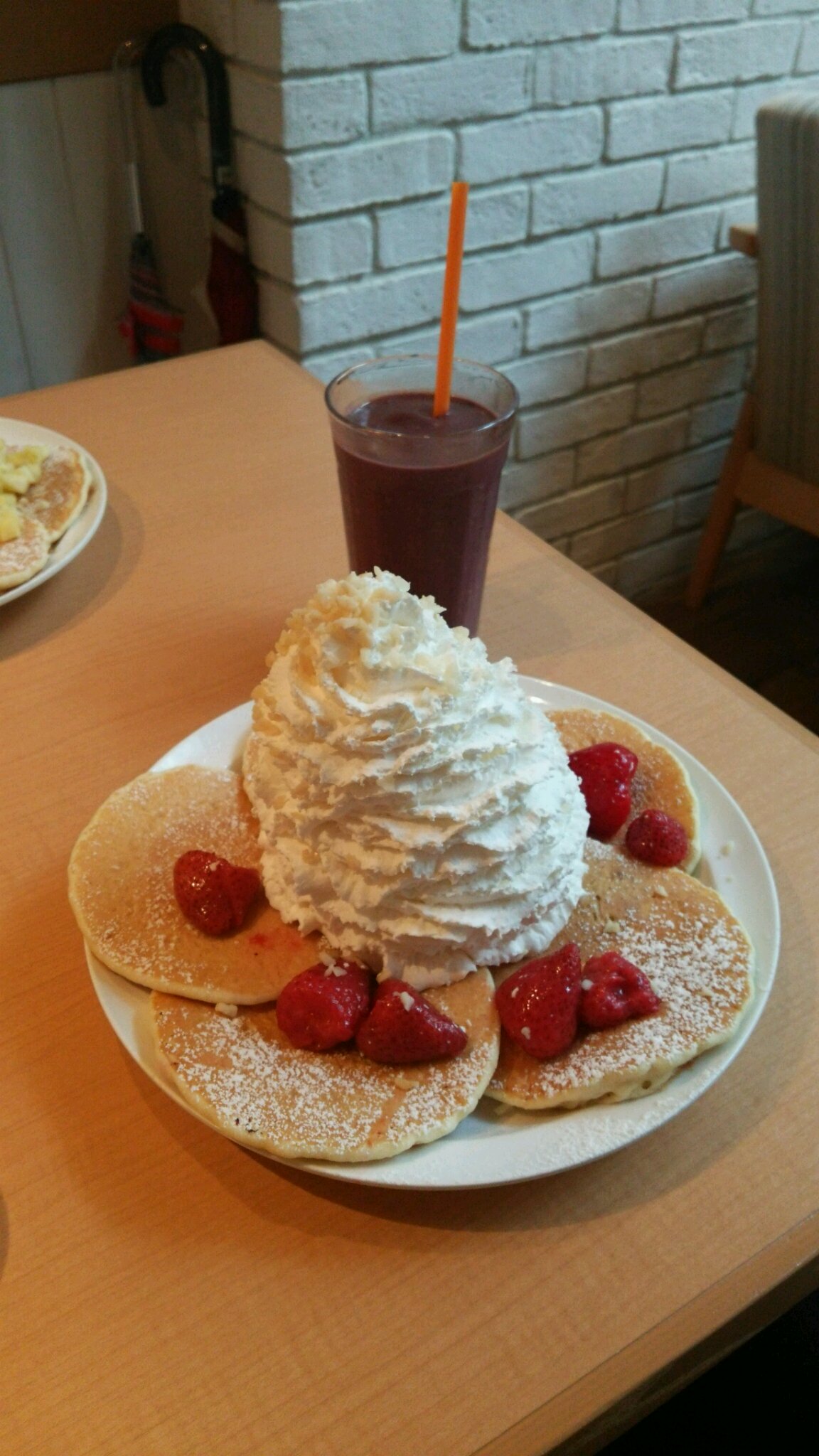 以前ハワイで食べたパンケーキが忘れられず、今回も同じ『ストロベリーホイップクリームとマカデミアナッツ』を注文しました![]()