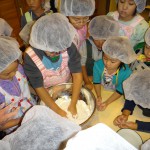 そば打ち体験では、粉に少しずつ水を加え、力を入れてこねていきます。