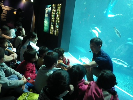 次は大水槽で最前列をキープし、お魚のショーをで見学!!![]()