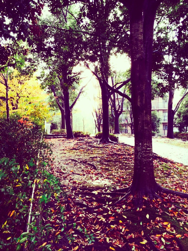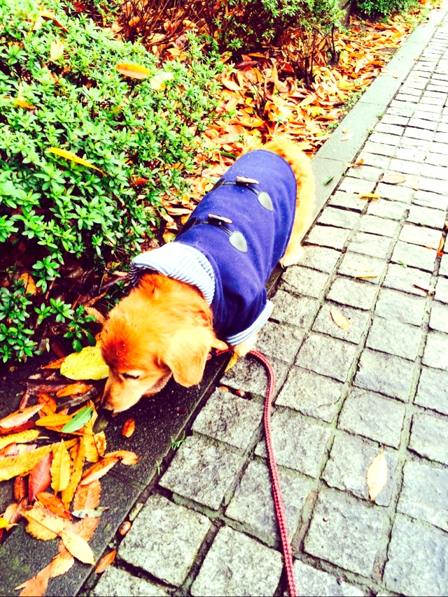 家の前の公園に行ったら、色んな色の木の葉が雨の影響でたくさん落ちていて、