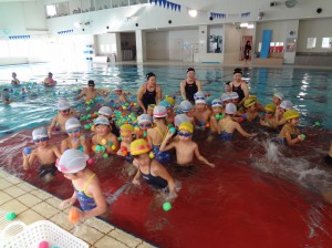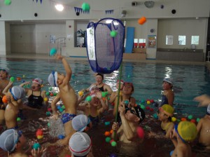 「赤」「黄色」「緑」チームに分かれて、4つの水中ゲームを行いました![]()