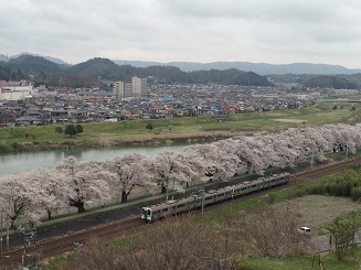 船岡駅に到着し、大河原駅に向けて出発すると「スピードを落として運行しております。一目千本桜をお楽しみください