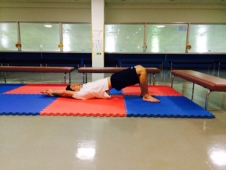 仰向けになり腰はばに脚を開き、お尻を上げ下げ。
