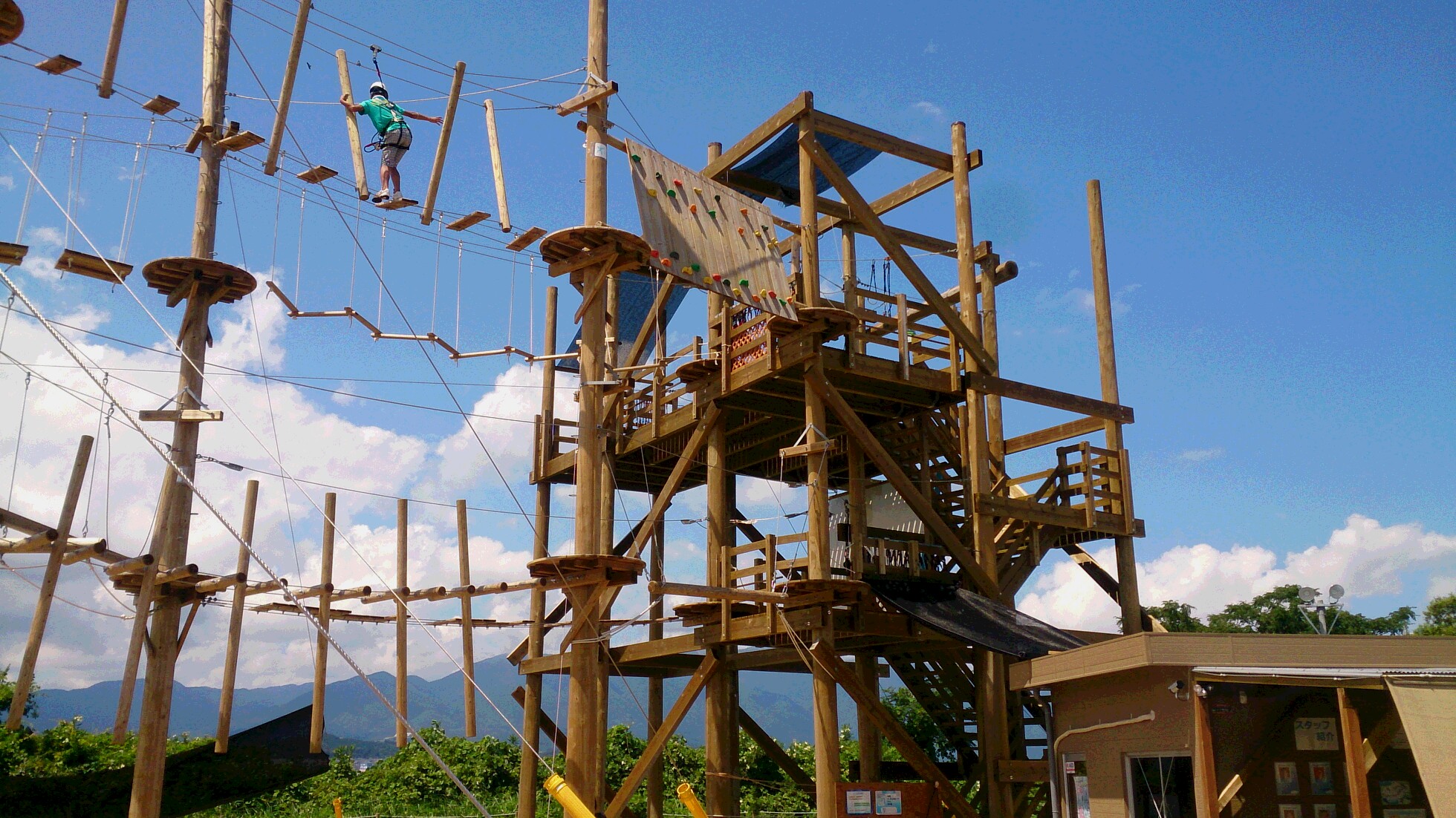 スカイアドベンチャーとは・・・大きなアスレチックのようなもので、体に安全ベルト(ハーネス)を装着し、4M・8Mの高さのアスレチックを回っていくものです![]()