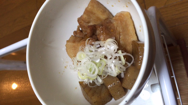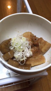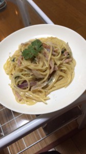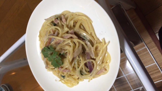 最近、作ったのは、豚の角煮、春菊とベーコンのクリームパスタです。
