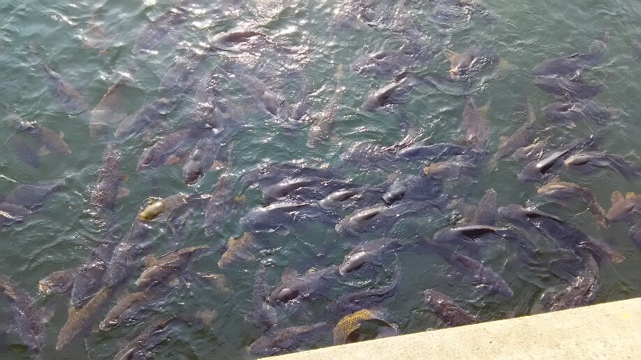 公園の外に川が流れていて、遊歩道になっている橋の上を歩くだけで鯉が寄ってくるのです。本当にいっぱい集まってくるのでしばらく眺めていても飽きがきませんでした。こんな状態の魚は水族館でしか見たことないですから。