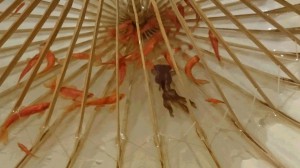 器にアクリル樹脂を流し込み、絵を描いては乾かし、