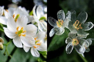 実はこのサンカヨウ、雨に濡れると不思議なことに白い花びらの部分だけ、