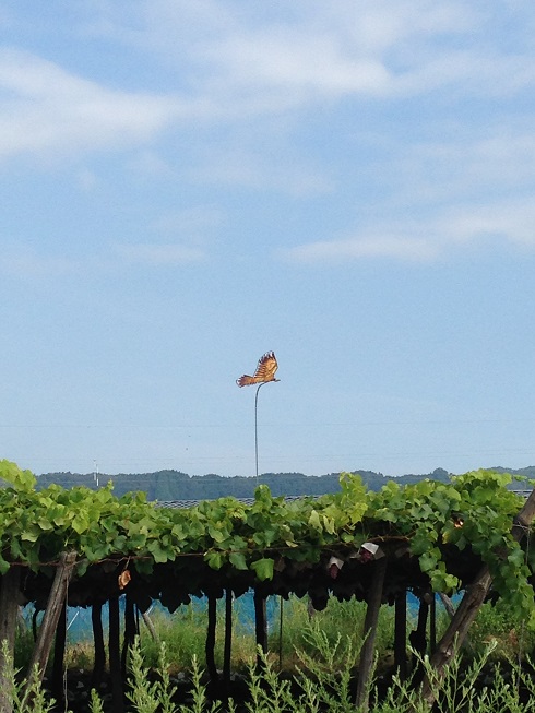 これは「案山子」の一種で、田や畑に設置して、鳥などから作物を守る為のものです。案山子というと、竹や藁で作られた人型のものが多いと思うのですが、最近ではこういったタイプのものがあるようです。この時期ぶどうの収穫が最盛期を迎える為、鷹や鷲がそこにいるかのようにして、鳥からぶどうを守っているのですね