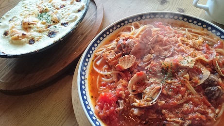手前はトマトとあさりとツナスパゲッティ![]()