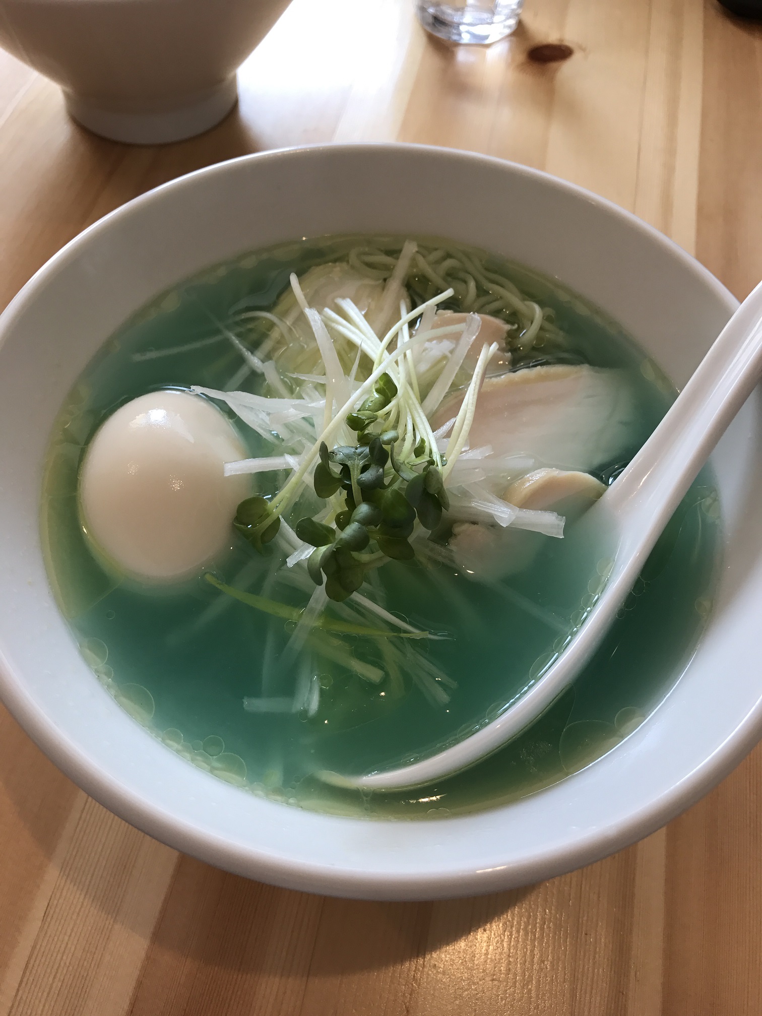 ラーメンが運ばれてくると、驚くほど透き通った青いスープで