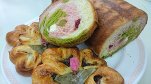 3色の生地を巻く際に、クランベリー・クリームチーズ・うぐいす豆も入れました![]()