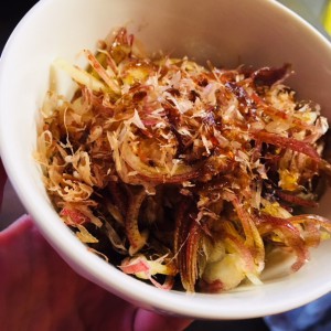 これを薄切りに細かく切って、オカカをかけて醤油で和えます。