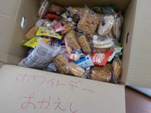 ちょっとガサツな感じではありますが、段ボールの箱にお菓子と愛がいっぱいです。