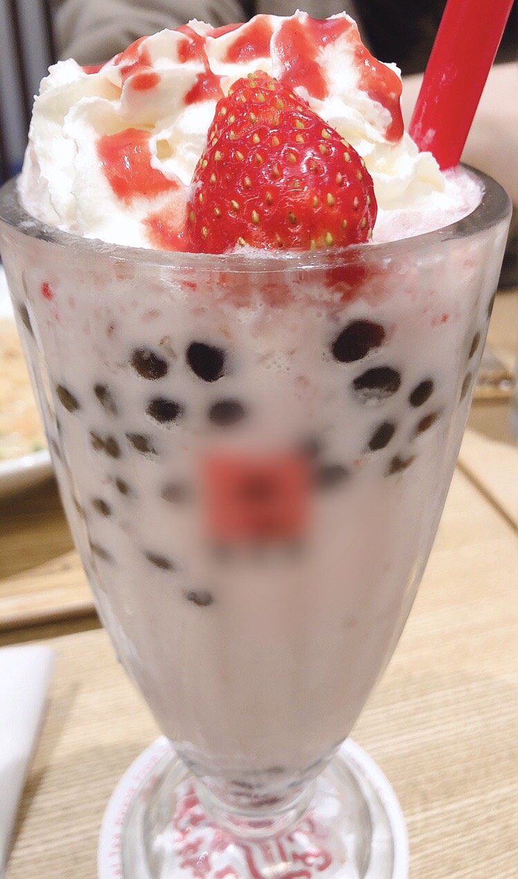 色もピンクで目で楽しめる+飲むと甘いいちごとクリーム、タピオカが合っていてとても美味しかったです!