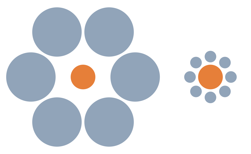 小さいものに周りに囲まれると大きく見えるという錯視です。