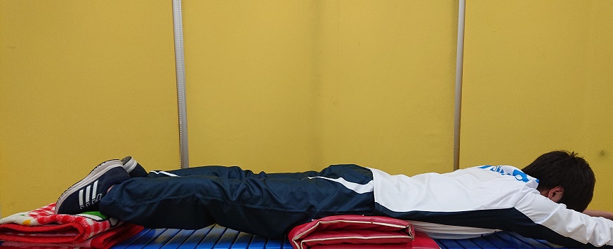 両足を延ばし、右左各かかとの下にハンドタオルをひいたら