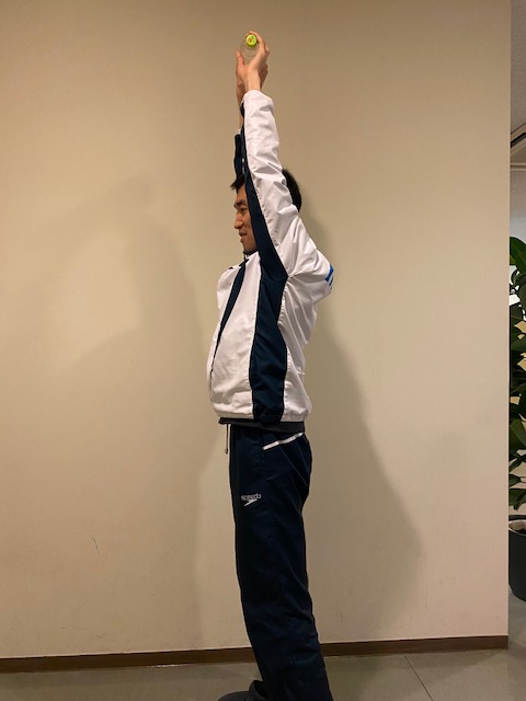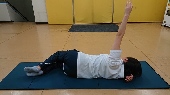 2.天井に向けて腕を持ち上げ、頭の方へと動かします