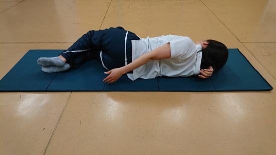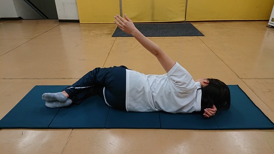 1.横向きに寝て、片腕を曲げてまくら変わりにします。