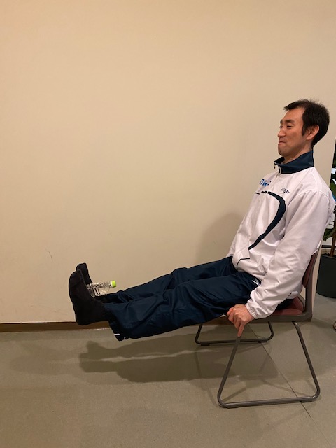 ②ペットボトルを両足ではさんで、膝を伸ばしながら
