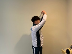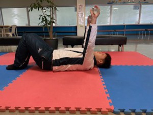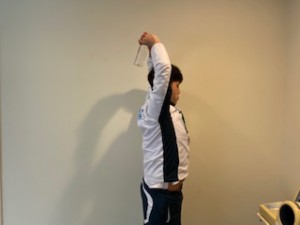 ⑤持ち上げたペットボトルを頭の後ろに来るようにゆっくり下ろします。
