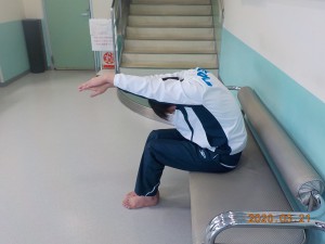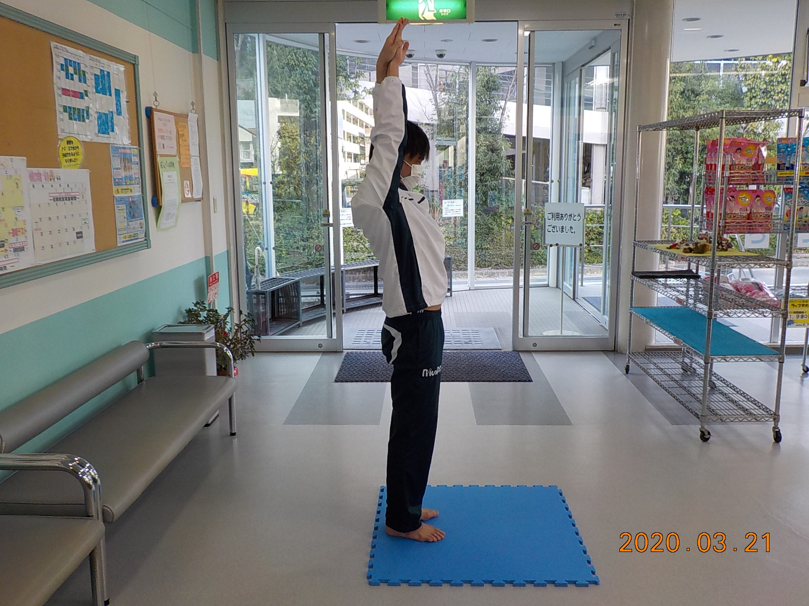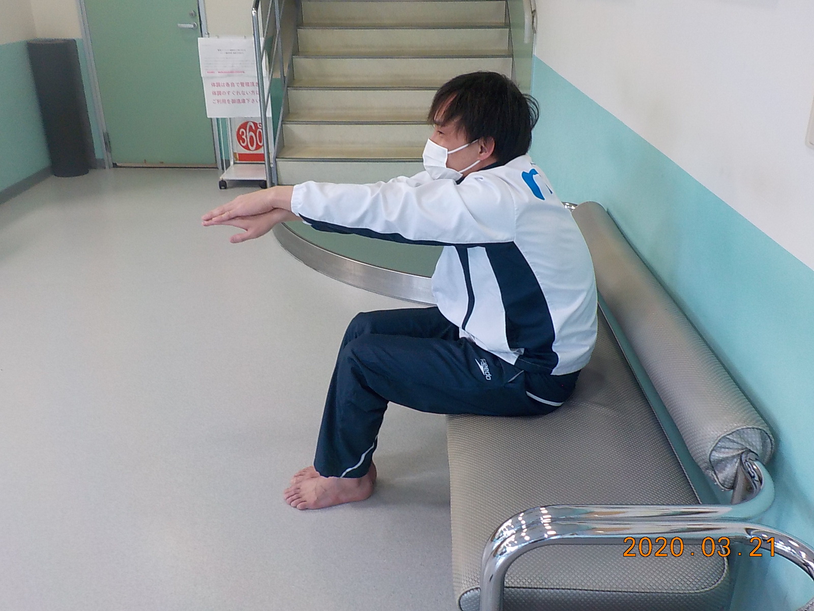 スタート前、手を組み、壁にお尻をつけた形をイメージしてください。