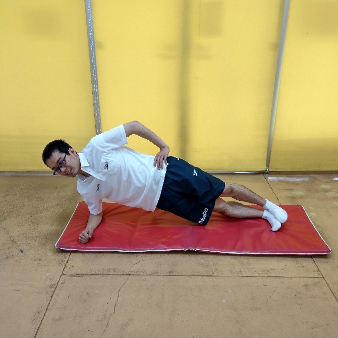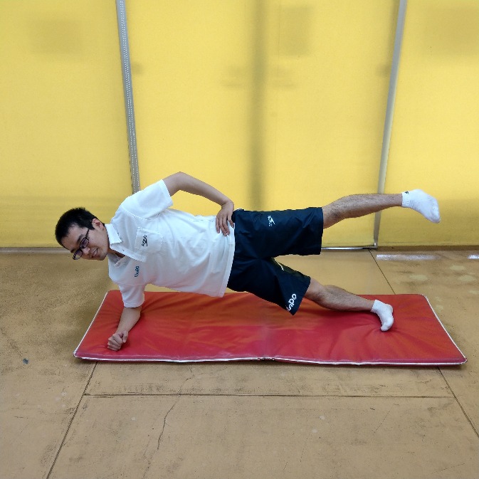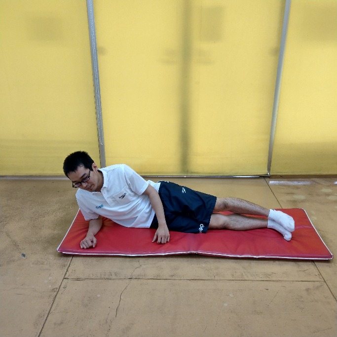 ②軽く胸を張り、上側の手を腰あたりに当て、体を支えている肘と脚で、体を持ち上げます。