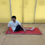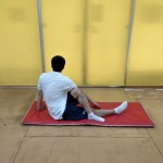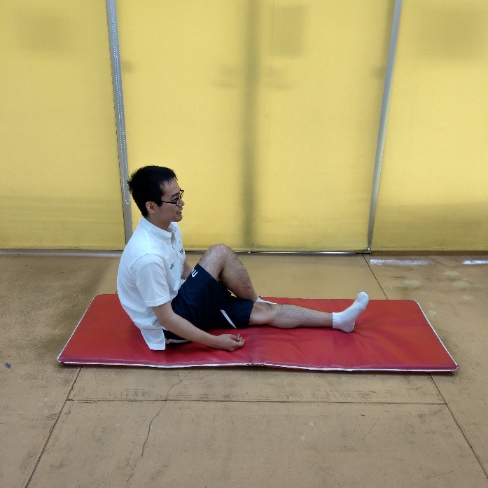 ③膝を曲げなかった方の手を曲げた膝の方へ持っていき、体をひねります。