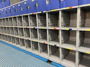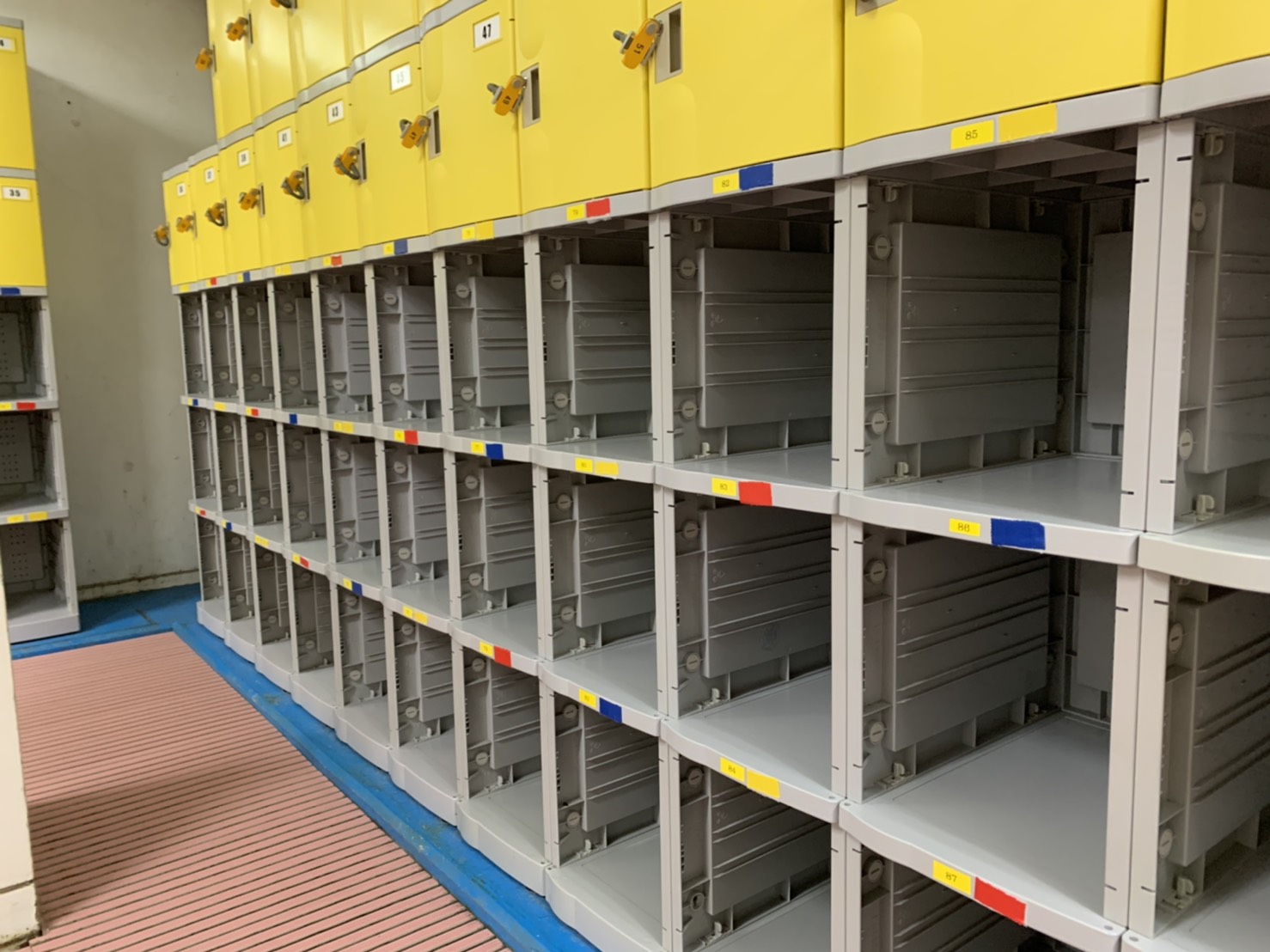 階段を下りる前に、何色のテープが貼ってあるロッカーを使えばいいかを確認してくださいね。