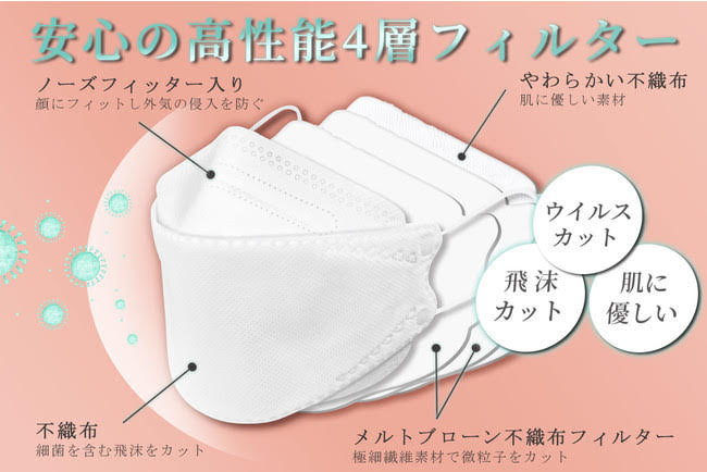 4層もの高性能フィルターによって花粉はもちろん、もっと小さな菌までをカットして口や鼻からの侵入をシャットアウトしてくれます。