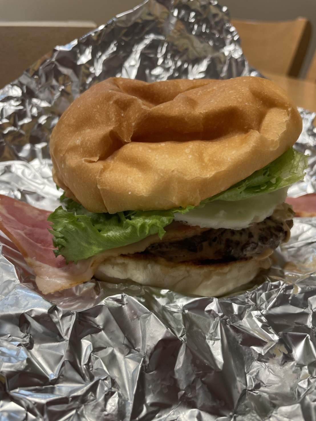 具はレタス、目玉焼き、ベーコン、玉ねぎ、ミンチのハンバーグ