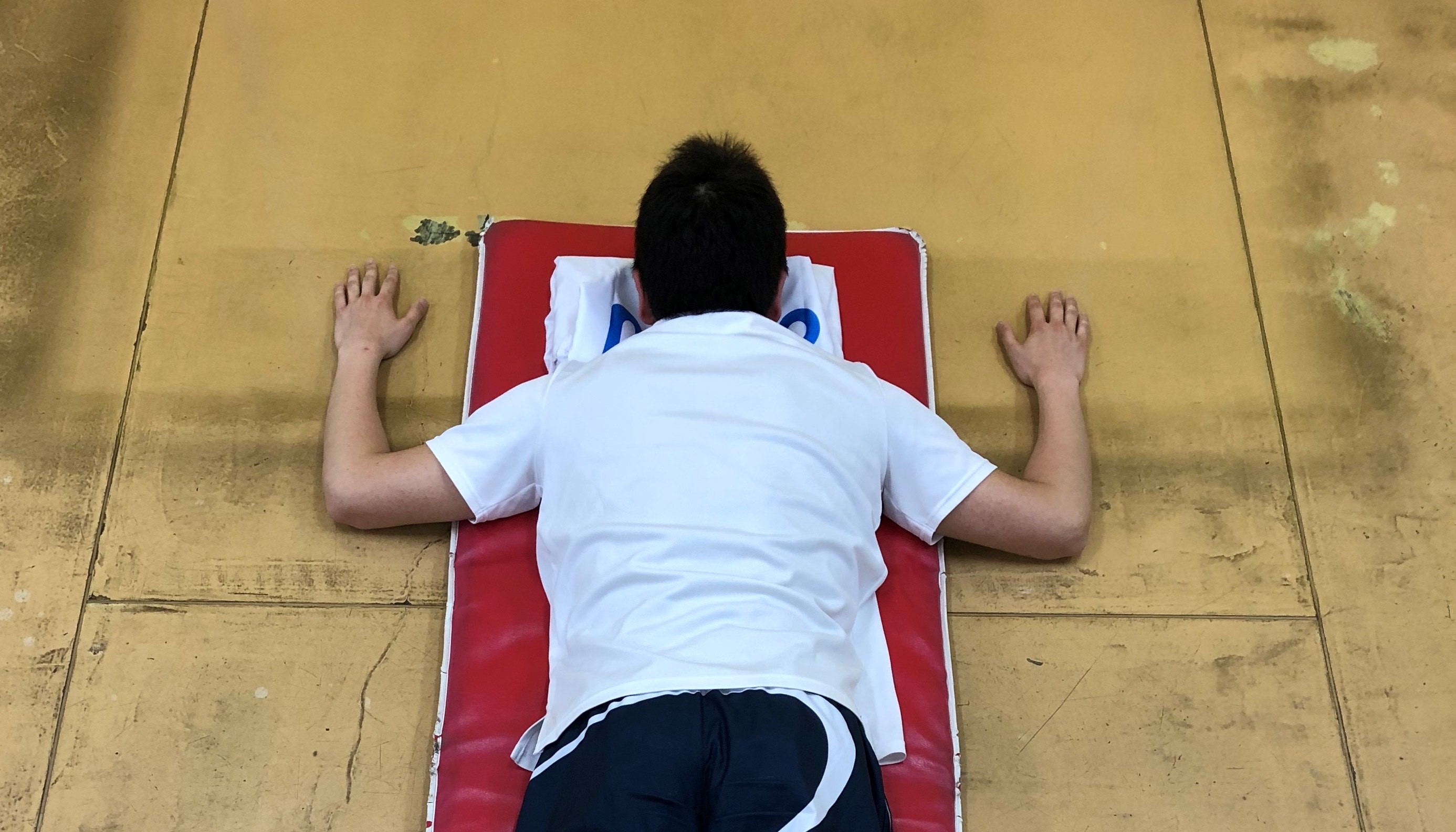 ①うつ伏せになったら、肘を曲げて手の平が顔の高さくらいになるように準備します。