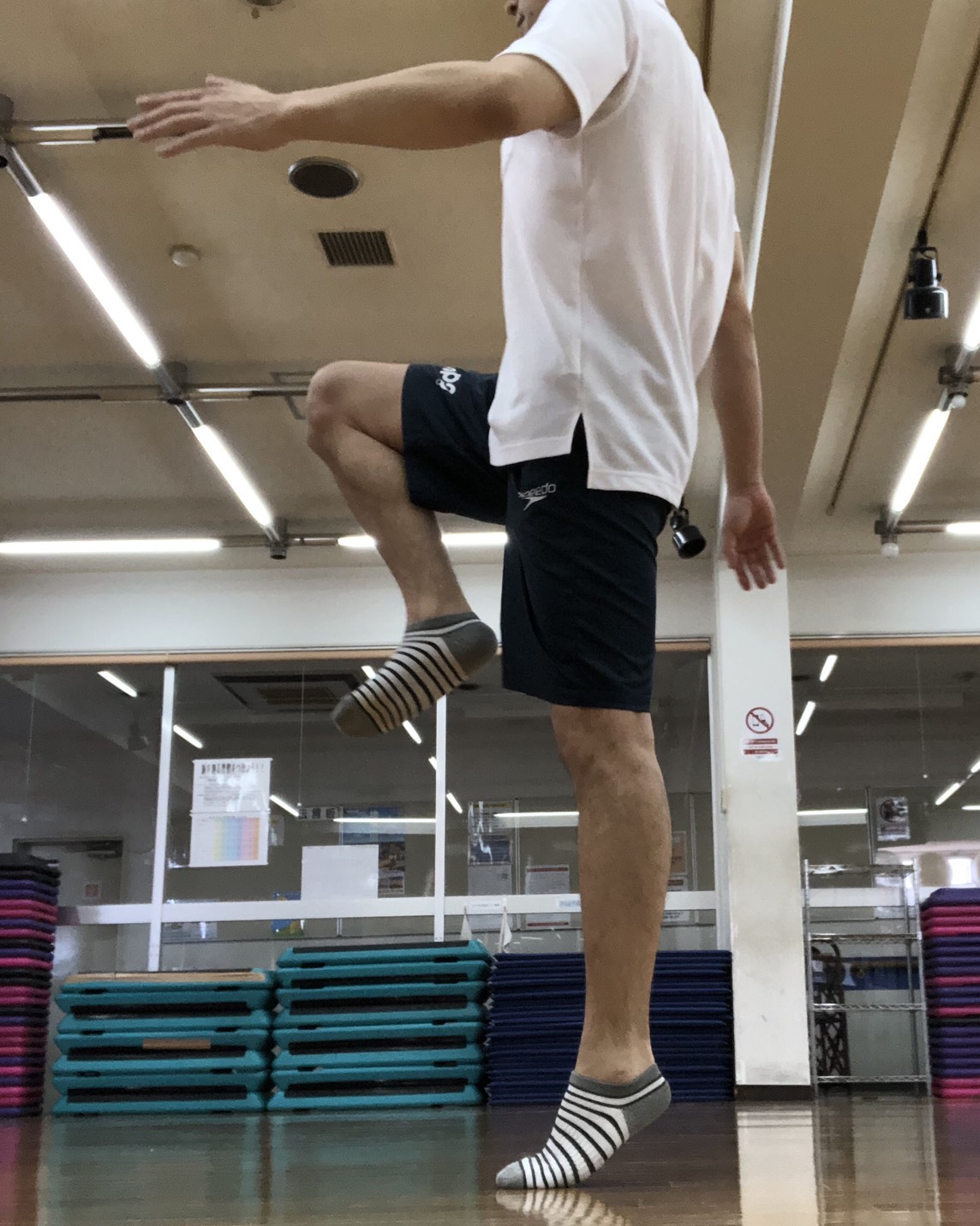 最後足を上げた時、軸足をつま先立ちにするとより負荷が上がります。