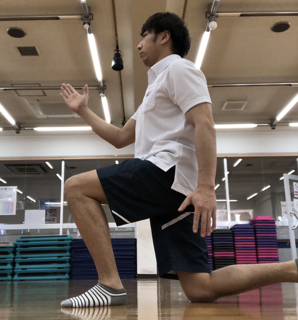 ①まず片足を膝立ちにし、反対の足を前に出します。その際、真っ直ぐな姿勢になる様意識しましょう。