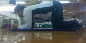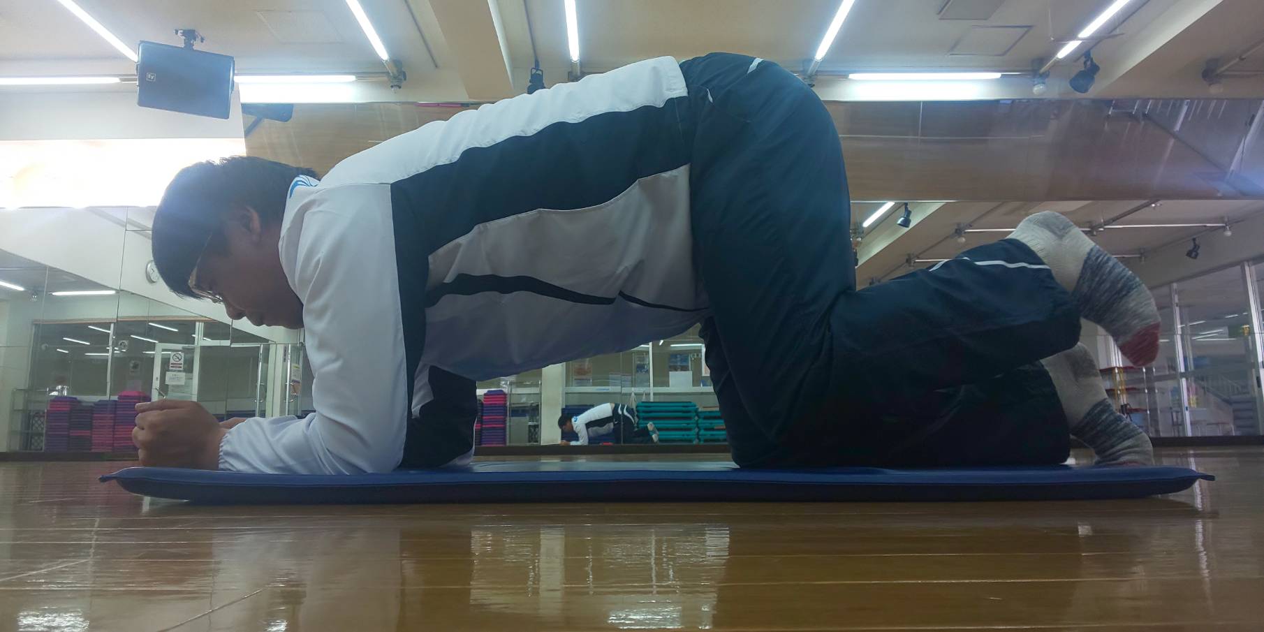 ①まずは、肘をついて四つん這いの姿勢になります。この時肘と膝が90℃になるようにしましょう。そしてお腹に力を入れて体重を前にかけます。