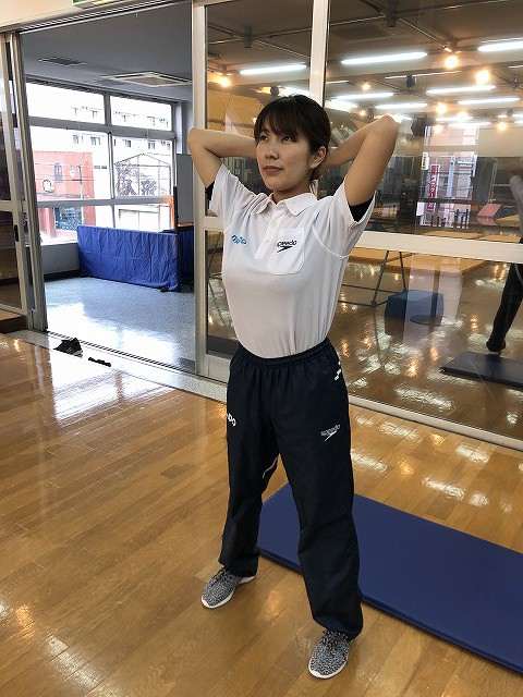 ①両腕を頭の後ろで組んで胸を張り、肘を左右へ開きます。肩甲骨の真ん中が「ぎゅっ」と