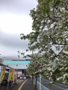 東岩槻店のすぐ側、駅前通りは両側、ハナミズキが満開です。