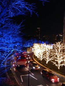 広場までの並木道にもライトアップがされており、シックでおしゃれな都会の夜