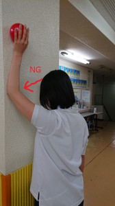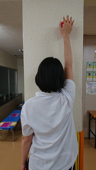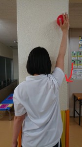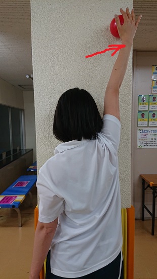 ①壁に向かい、片手を挙げます。(壁と手の平の間にボールを準備)
