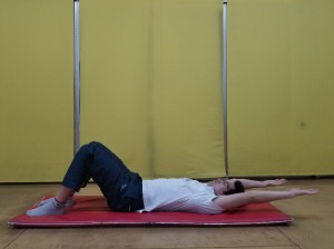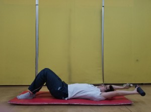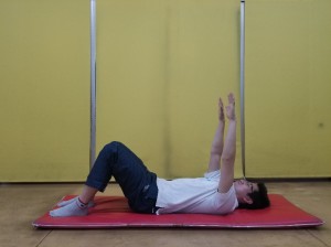 ①仰向けに寝て、膝を立て、両手はバンザイにします。