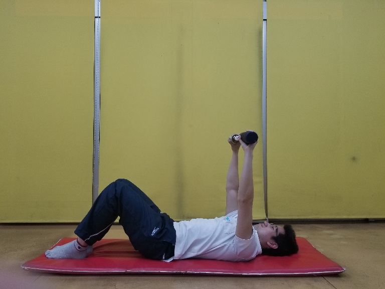 ②息を吐きながら、天井に向けて両腕を同じタイミングで持ち上げましょう。