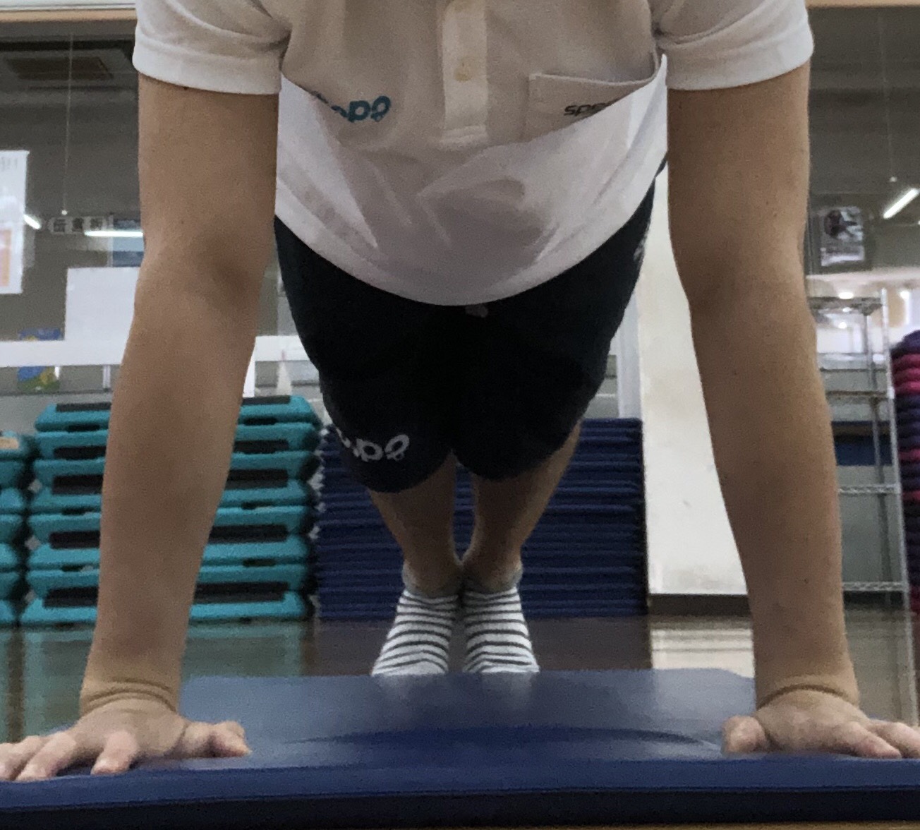 ①両手を肩幅で肩の下ぐらいに床に着きます。(出来る方はつま先立ちで、難しい方は膝をつきましょう。)